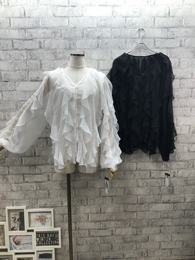 ayaneのシフォンフリルブラウス。 前後身頃、袖にたっぷりのフリル。シースルー素材なのでとても軽やかです。 コーディネートがいっきに華やぐおしゃれブラウス。