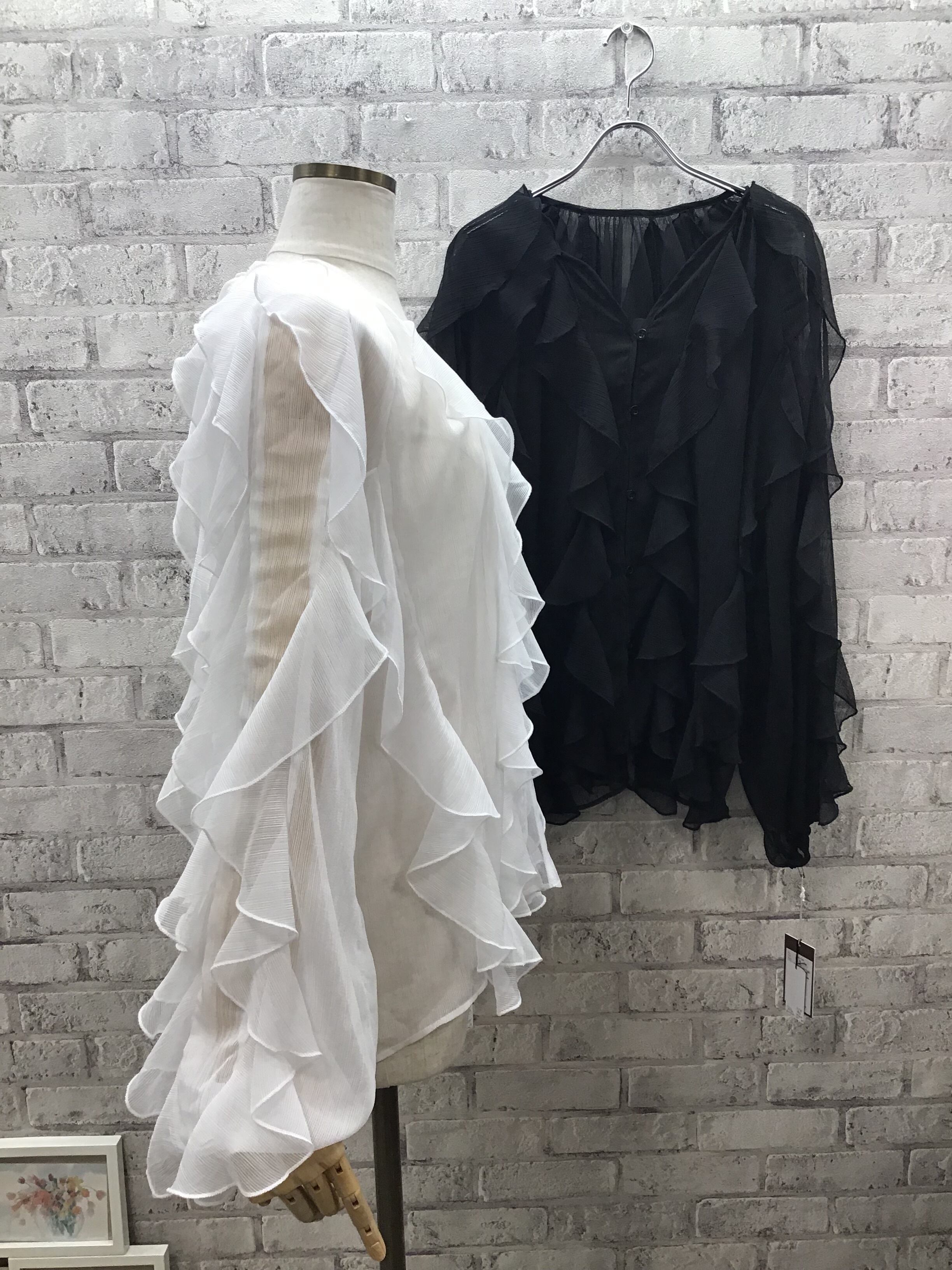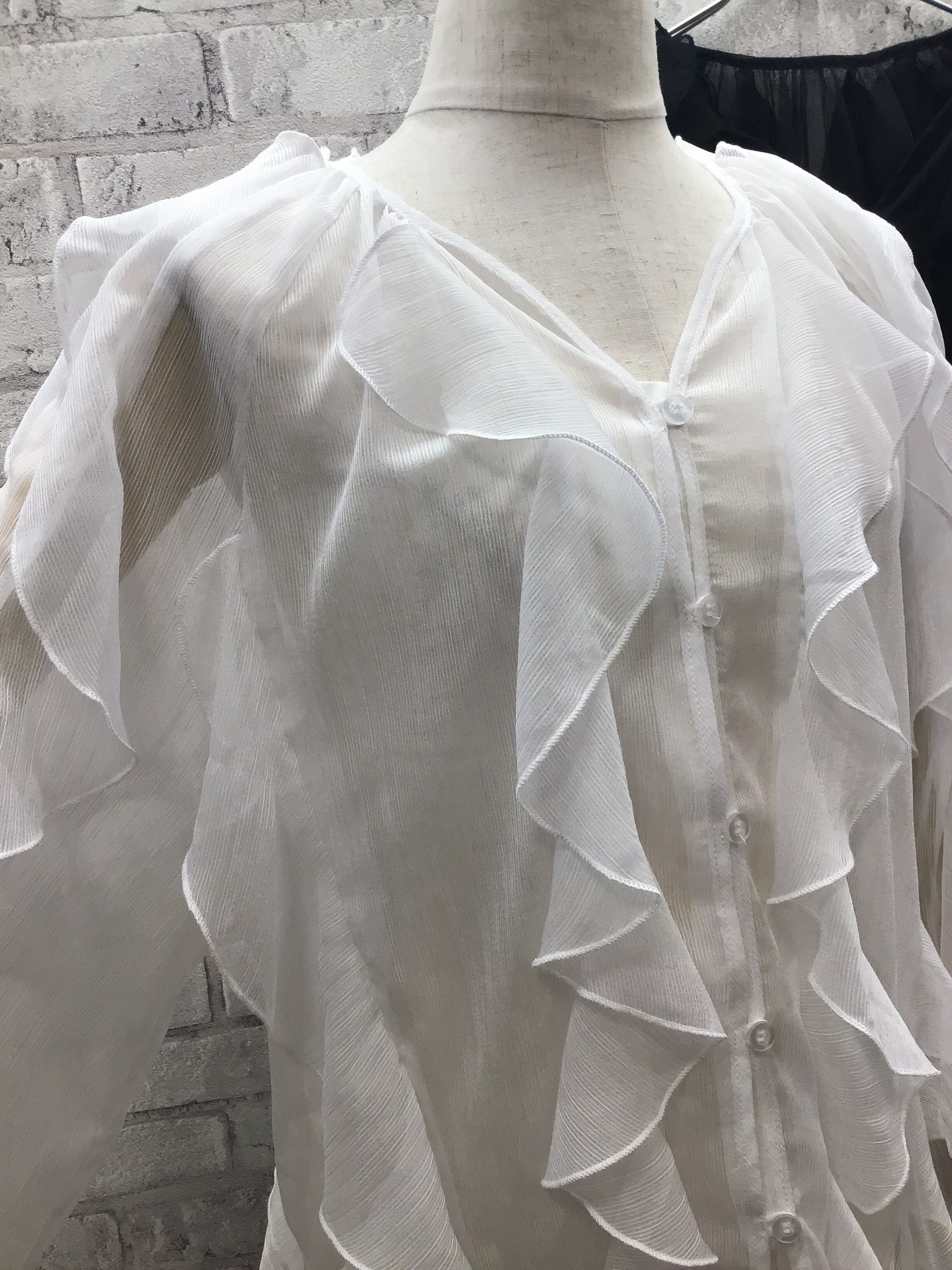前後身頃、袖にたっぷりのフリル。シースルー素材なのでとても軽やかです。