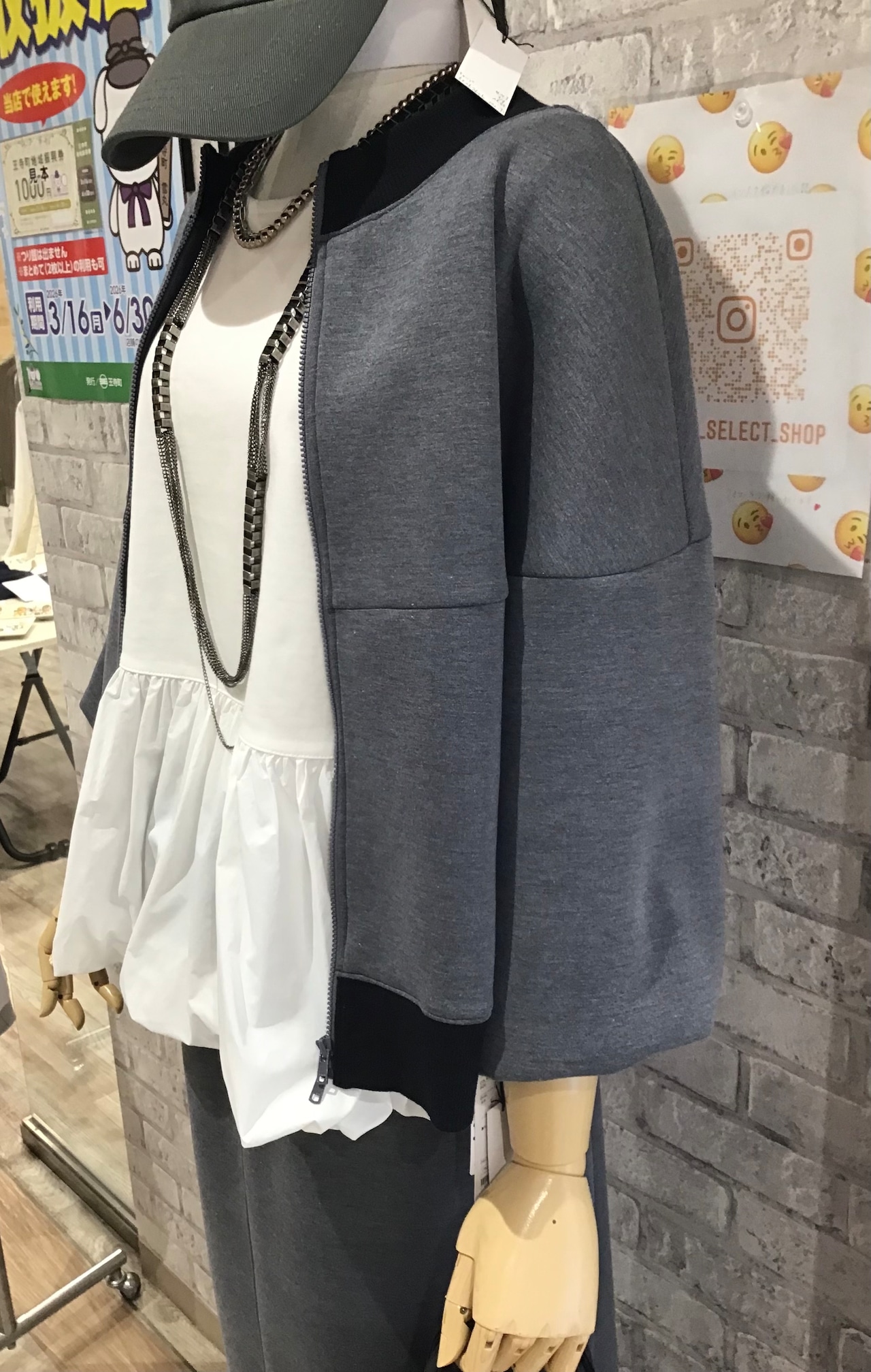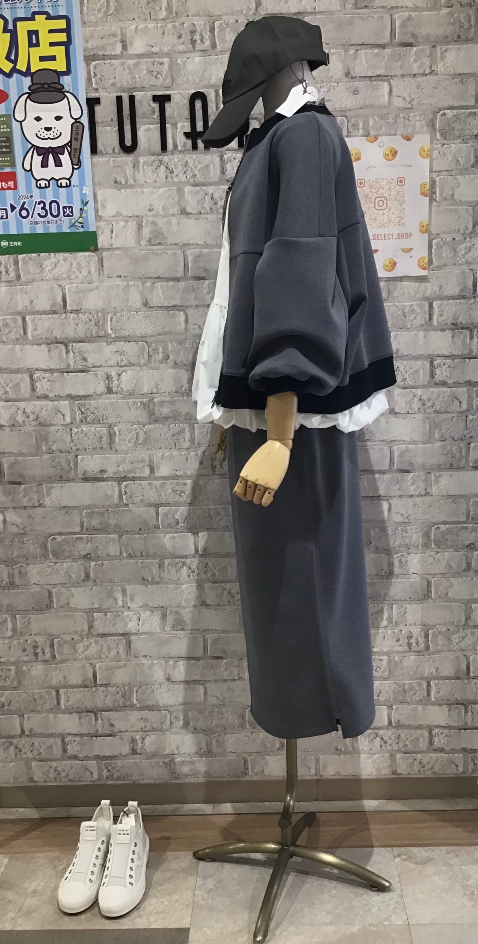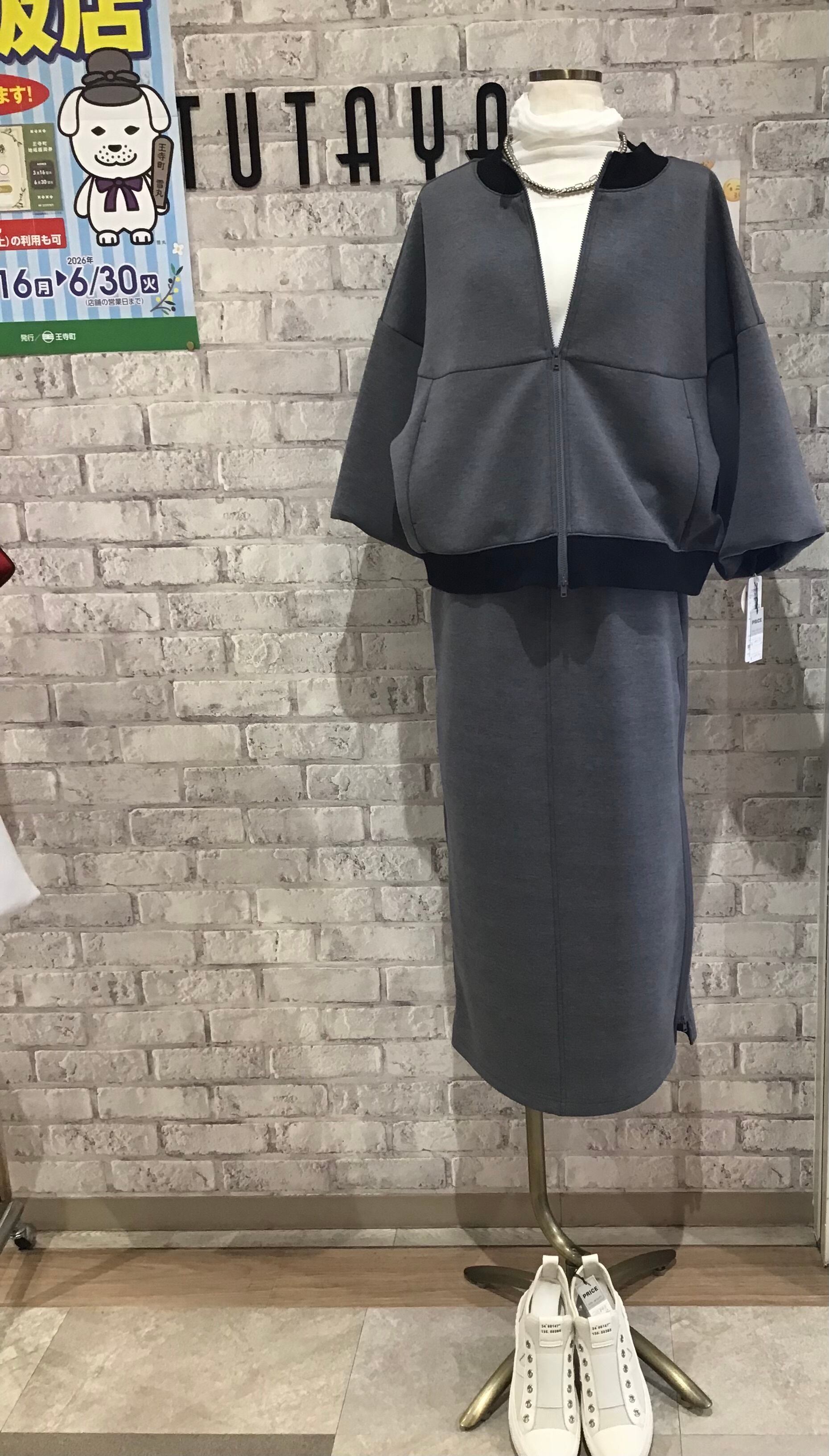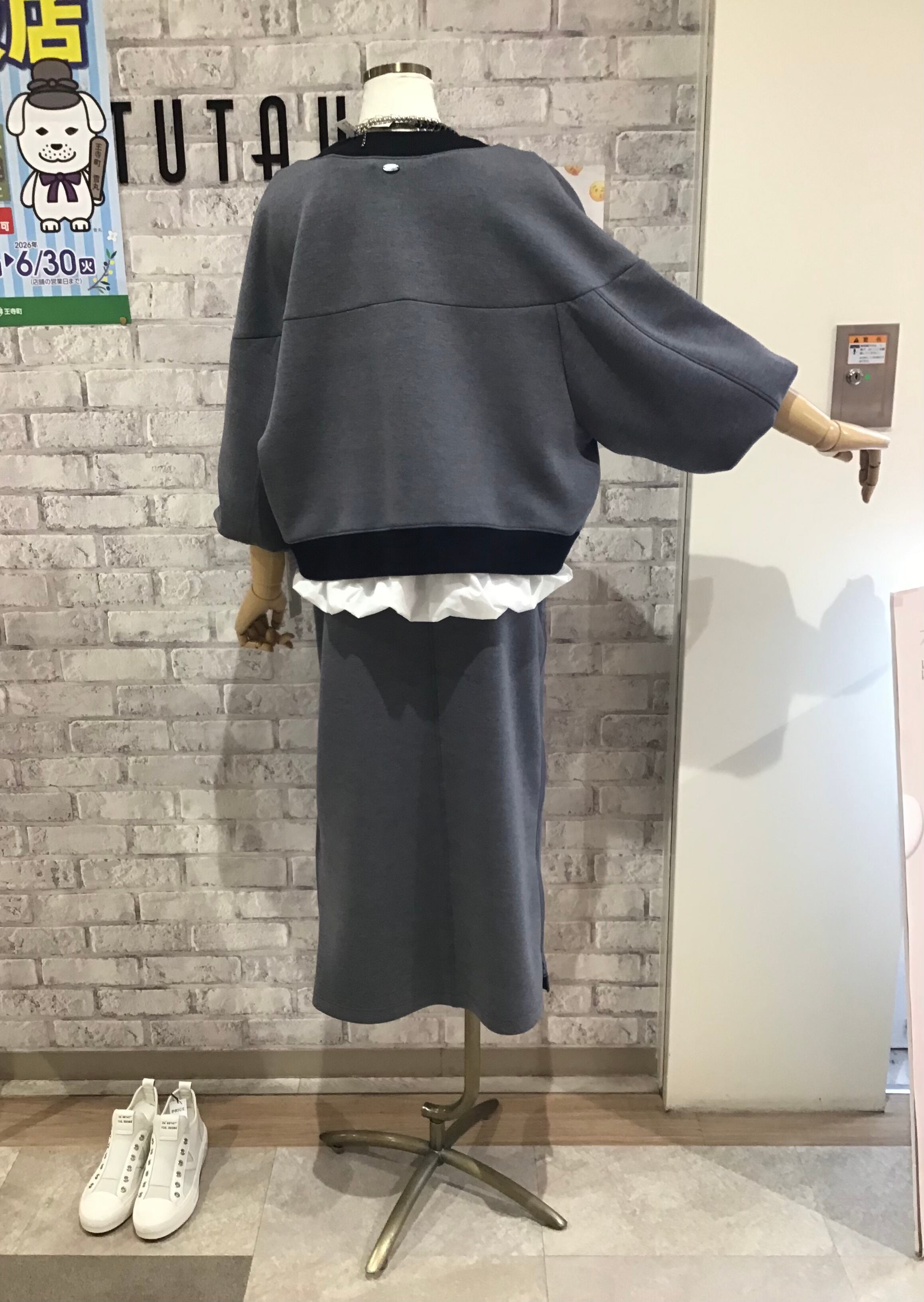 同素材スカートもありますので、セットアップで完成度の高いコーディネートを。